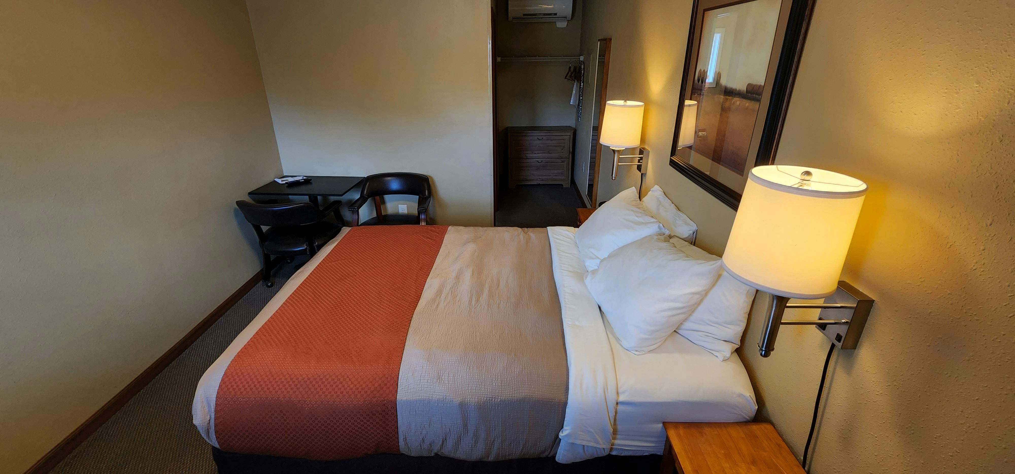 Experience the comfort and convenience of our single queen room. Perfect for solo travelers or couples, this cozy room features a comfortable queen-size bed, a private bathroom and all the amenities you need for a comfortable stay. The room is equipped with a mini-fridge, a microwave, and a flat-screen TV, so you can keep your snacks and drinks cold, heat up a meal and catch up on your favorite shows. The room is decorated with a warm and inviting atmosphere, that will make you feel right at home. Whether you're here for a business trip or a leisurely vacation, our room offers the perfect blend of comfort and convenience. With a homely feel, this room is an ideal choice for those who appreciate a more intimate setting and want to relax in a comfortable and cozy space.