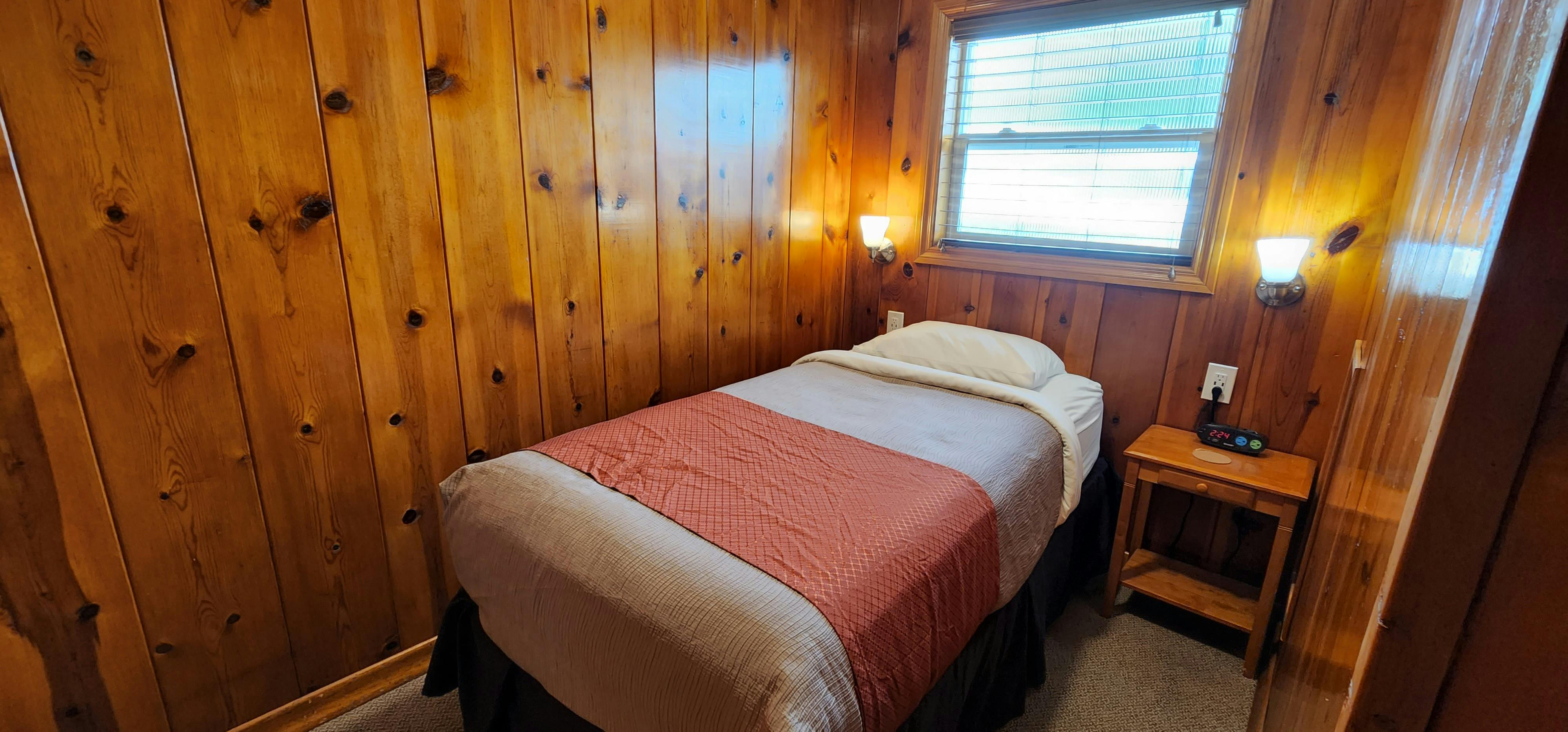 Experience the unique charm of our queen room with a private twin bed nook. Perfect for families or small groups, this room features a comfortable queen-size bed in the main room and a private twin bed nook located next to the bathroom. The room also comes with a private bathroom, a mini-fridge, a microwave, and a flat-screen TV, providing all the amenities you need for a comfortable stay. The room is decorated with a warm and inviting atmosphere that will make you feel right at home. The private twin bed nook is a great space for children to sleep or for a third person to stay. With a homely feel, this room is an ideal choice for those who appreciate a more intimate setting and want to relax in a comfortable and cozy space. Whether you're here for a weekend getaway or an extended stay, our room offers the perfect blend of comfort and convenience.